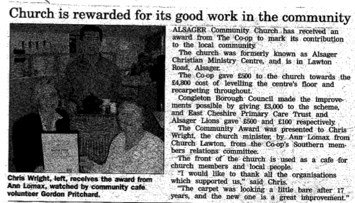 He in turn, was then suceeded by Matthew and Christine Wright who served as Pastors until 2012 after over 13 years of ministry into the church, having first become associated with the church whilst students at the Elim Bible College, then in Nantwich. They changed the name again, to Alsager Community Church.